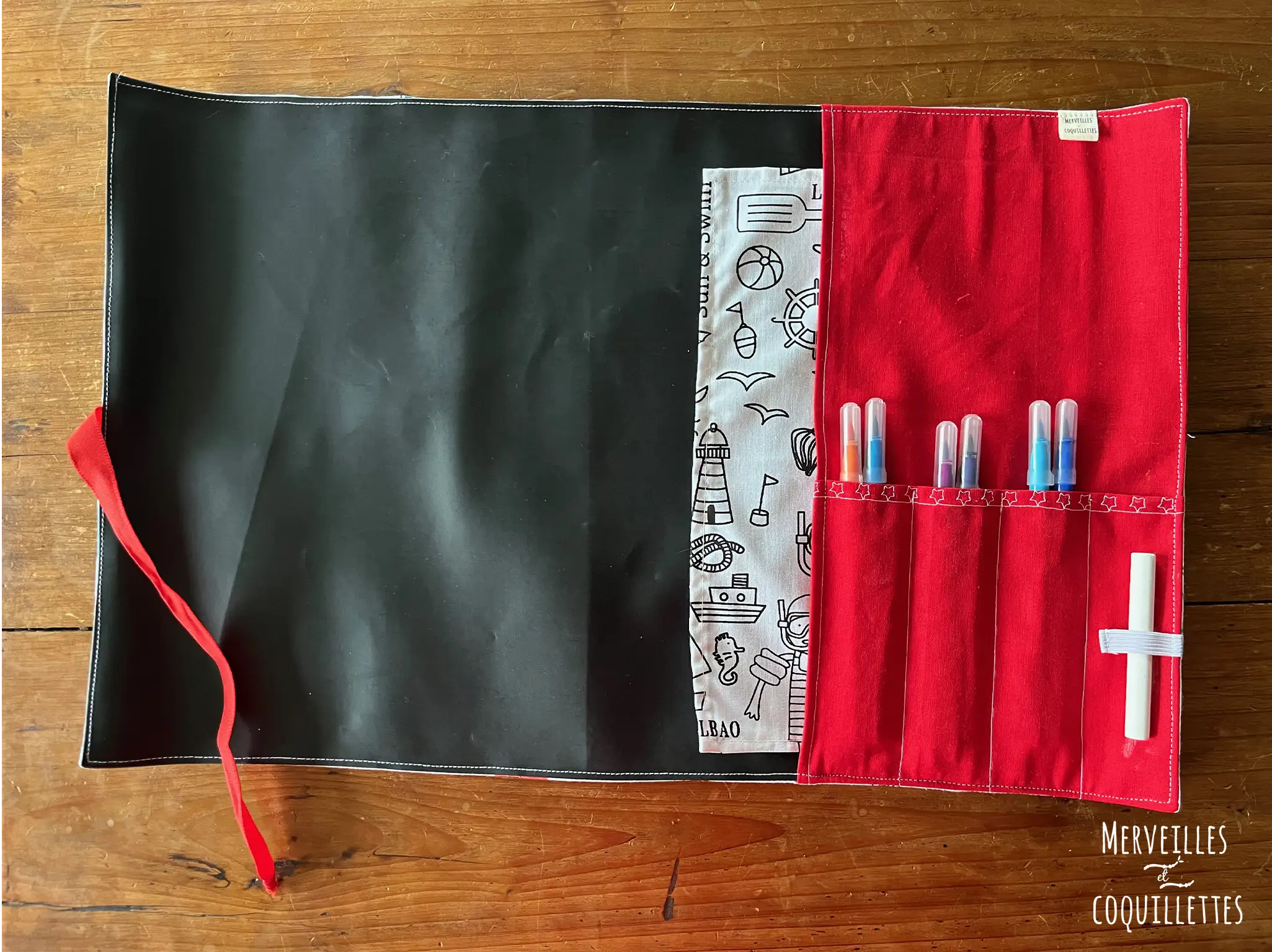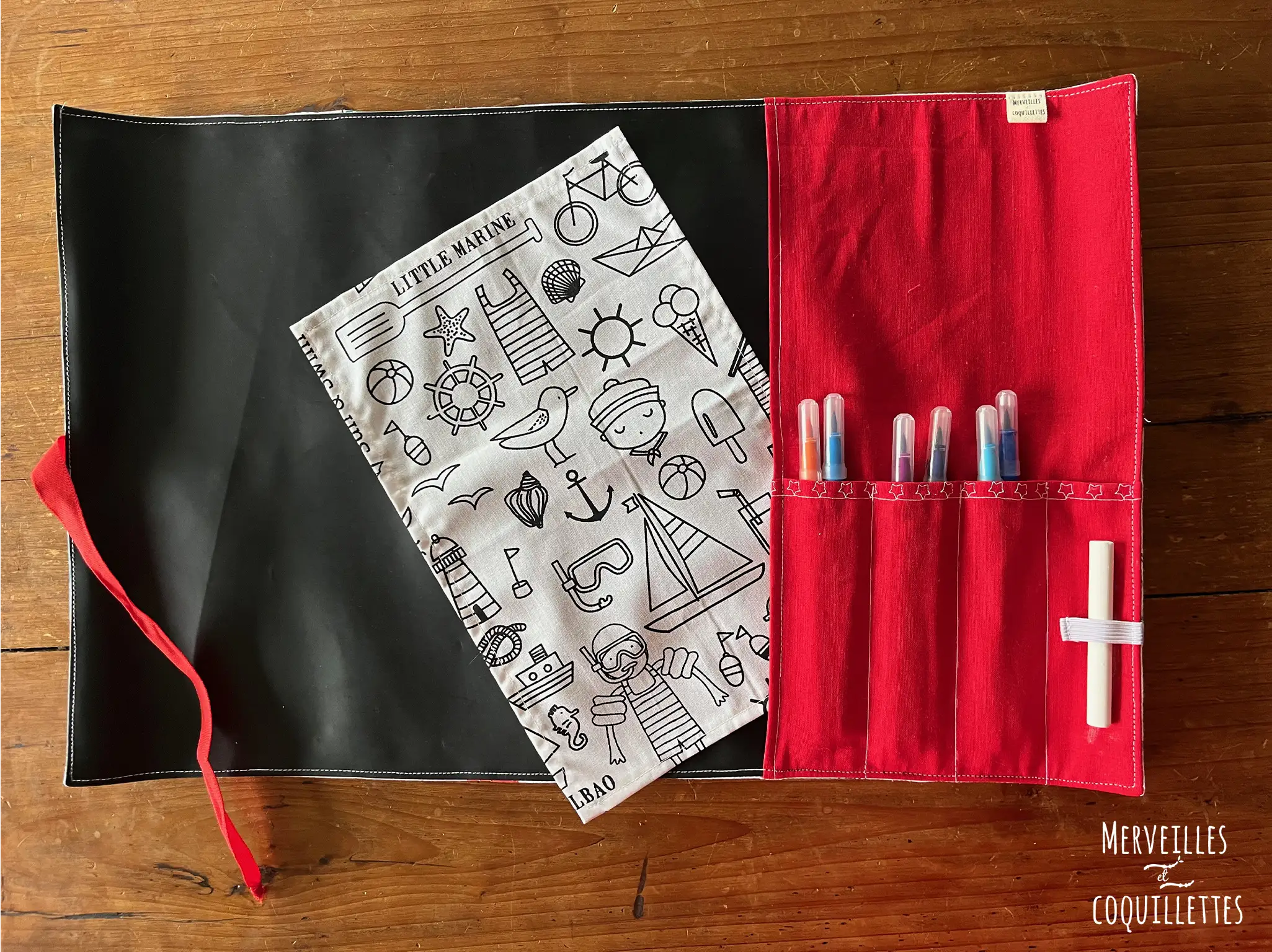 Carnet créatif nomade et zéro déchets pour dessiner en toute circonstance. Un emplacement pour une craie, 3 à 6 feutres et des feuilles.