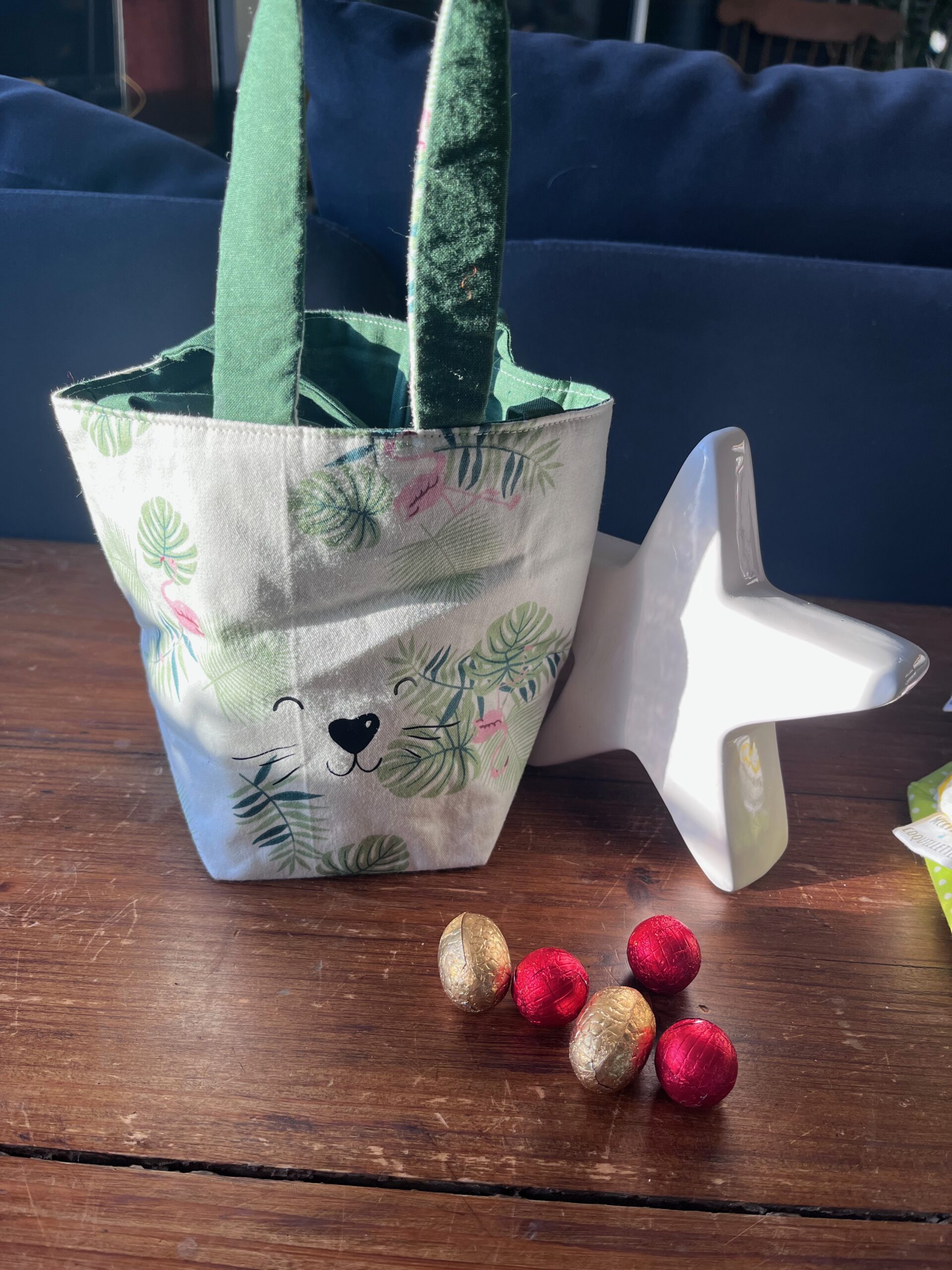 Petit panier avec anses et oreilles de lapin pour ramasser les chocolats de Pâques