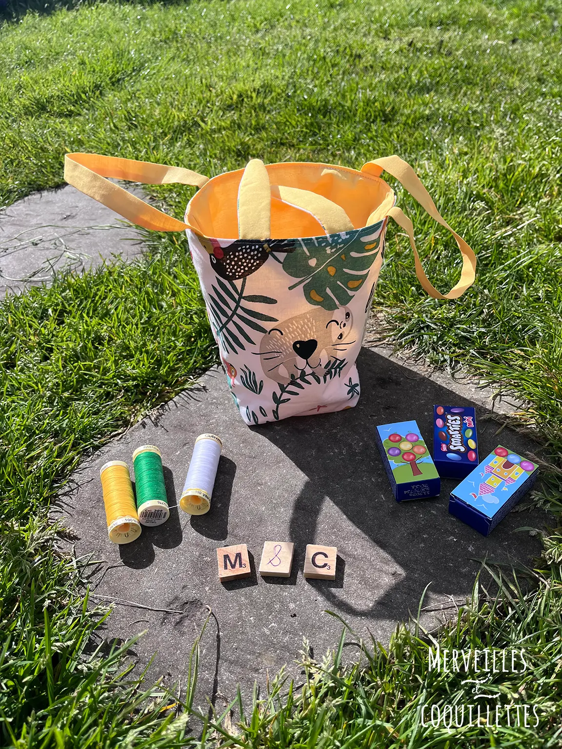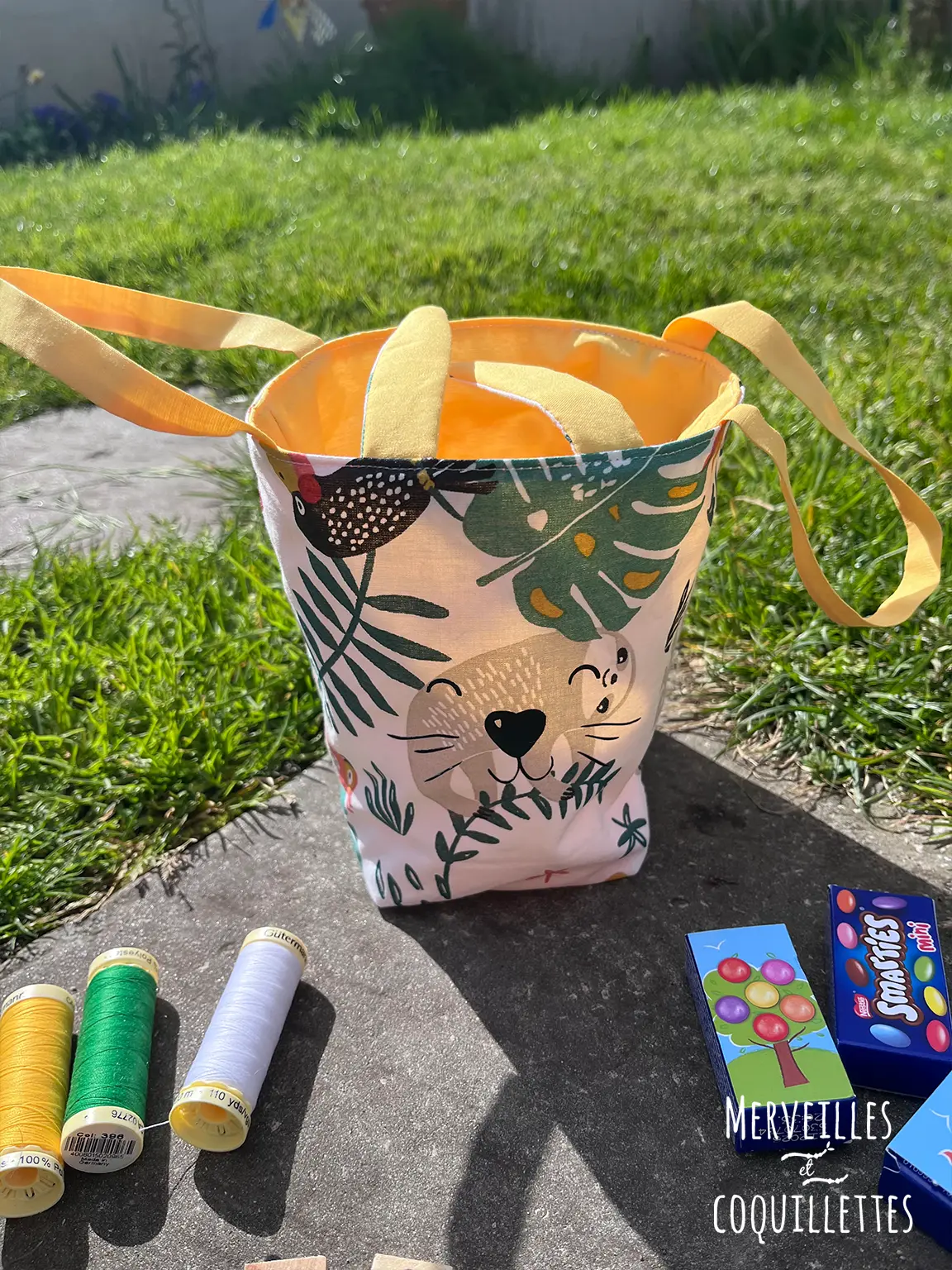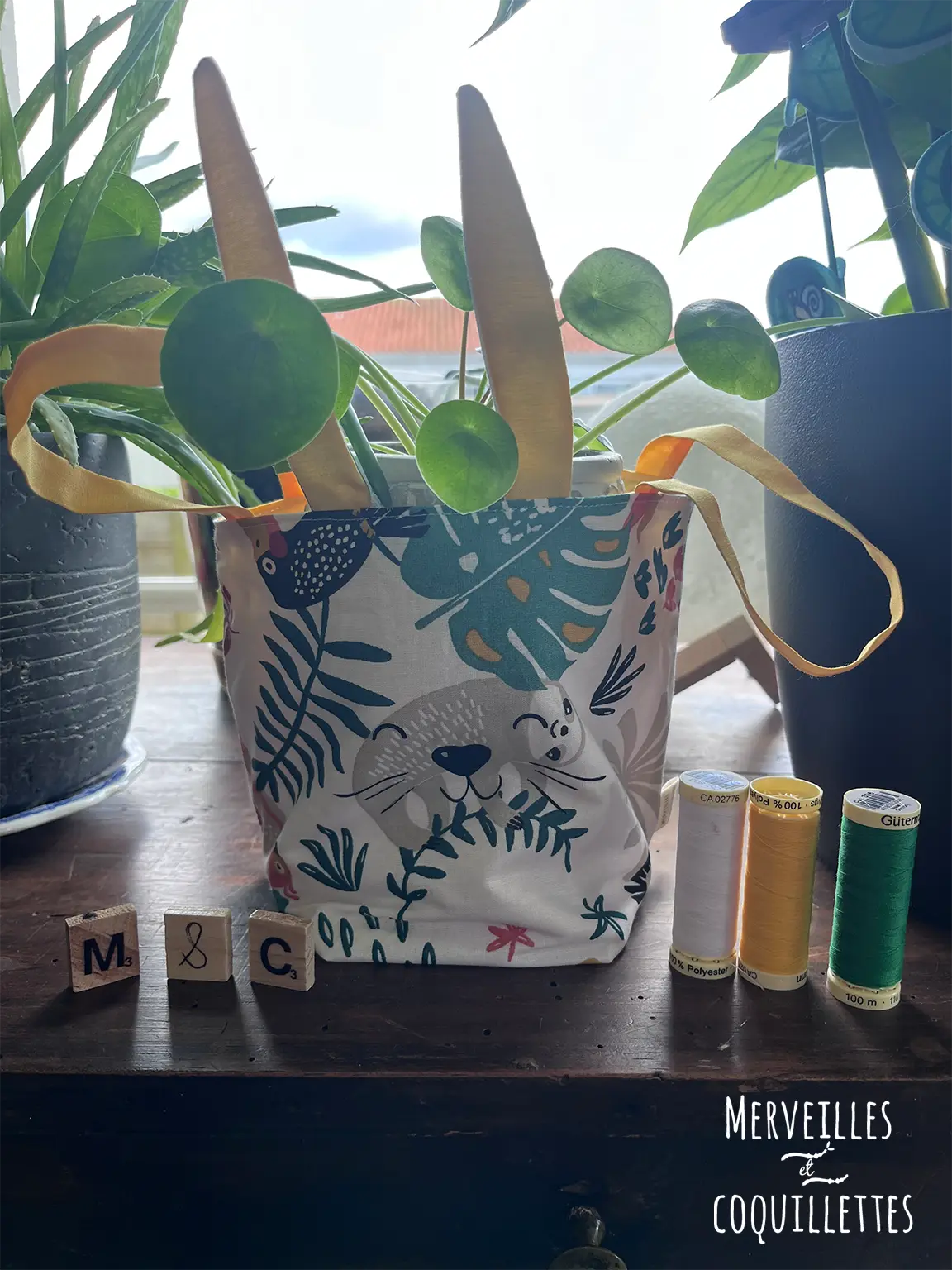 Ce panier est constituée d’un tissu imprimé « savane » et un coton uni vert.