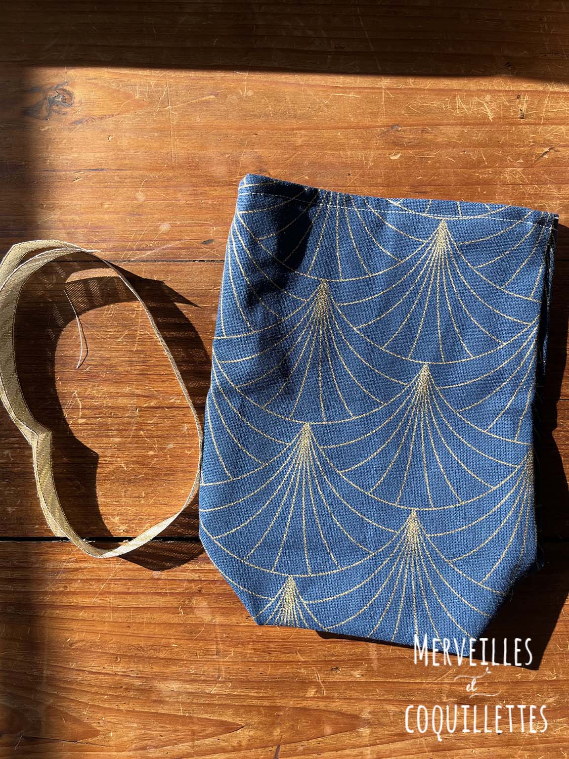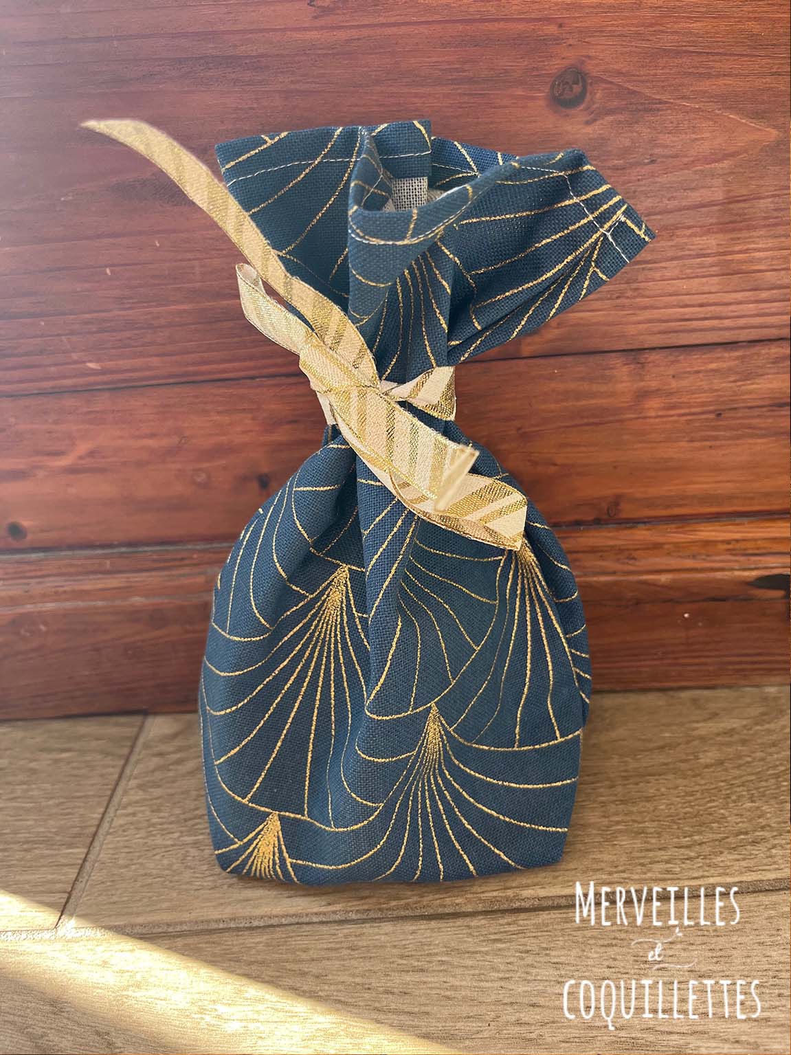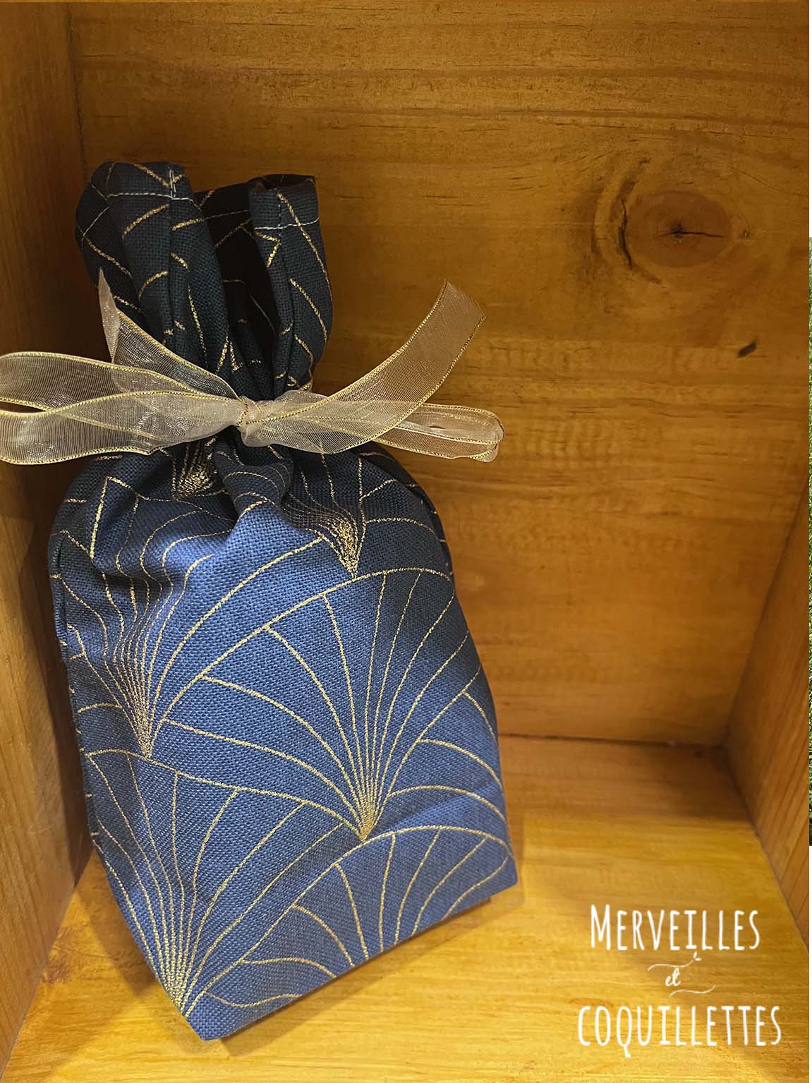 Pochette cadeau en tissu réutilisable avec ruban de fermeture.