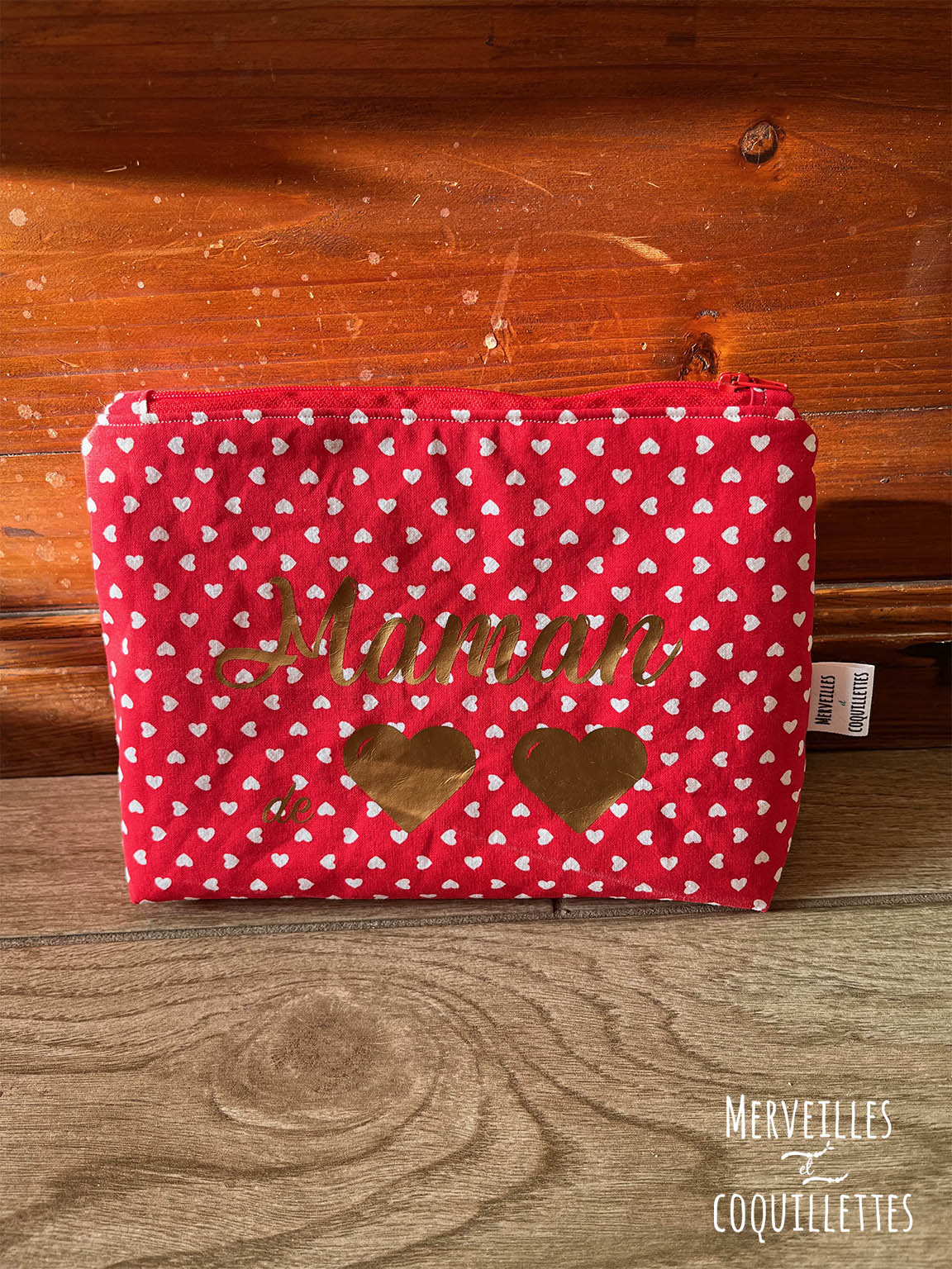 Cette pochette est constituée d’un tissu matelassé imprimé « coeurs » et un coton uni rouge. Le tout fermé par une petite fermeture éclair.