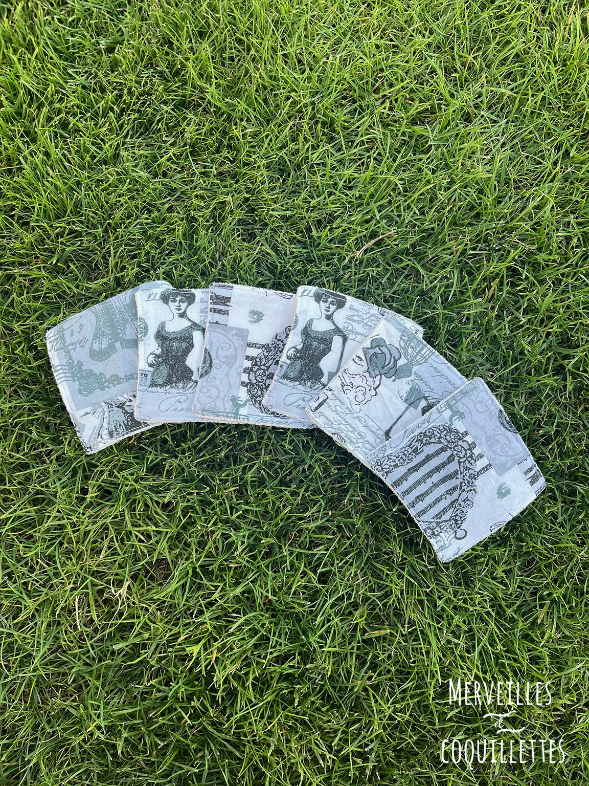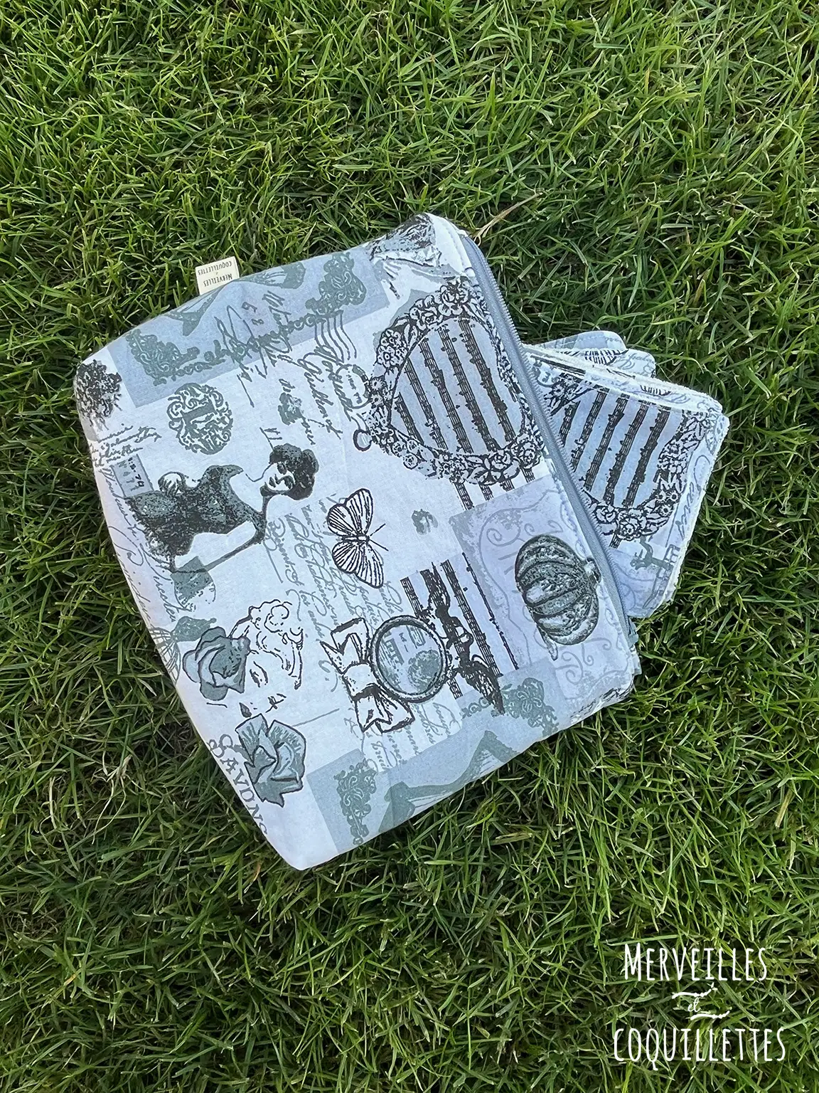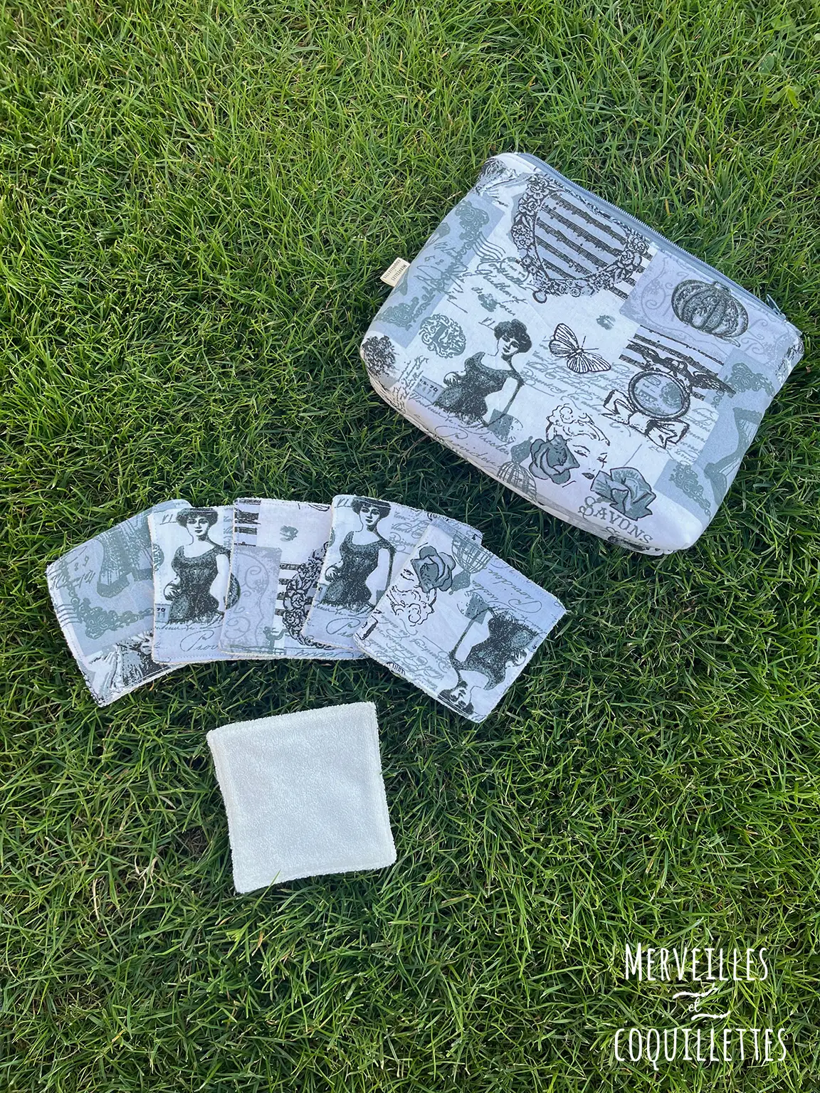 Cette pochette est constituée d’un tissu matelassé imprimé « boudoir » et une doublure assorti contient 6 lingettes lavables. Le tout fermé par une petite fermeture éclair.