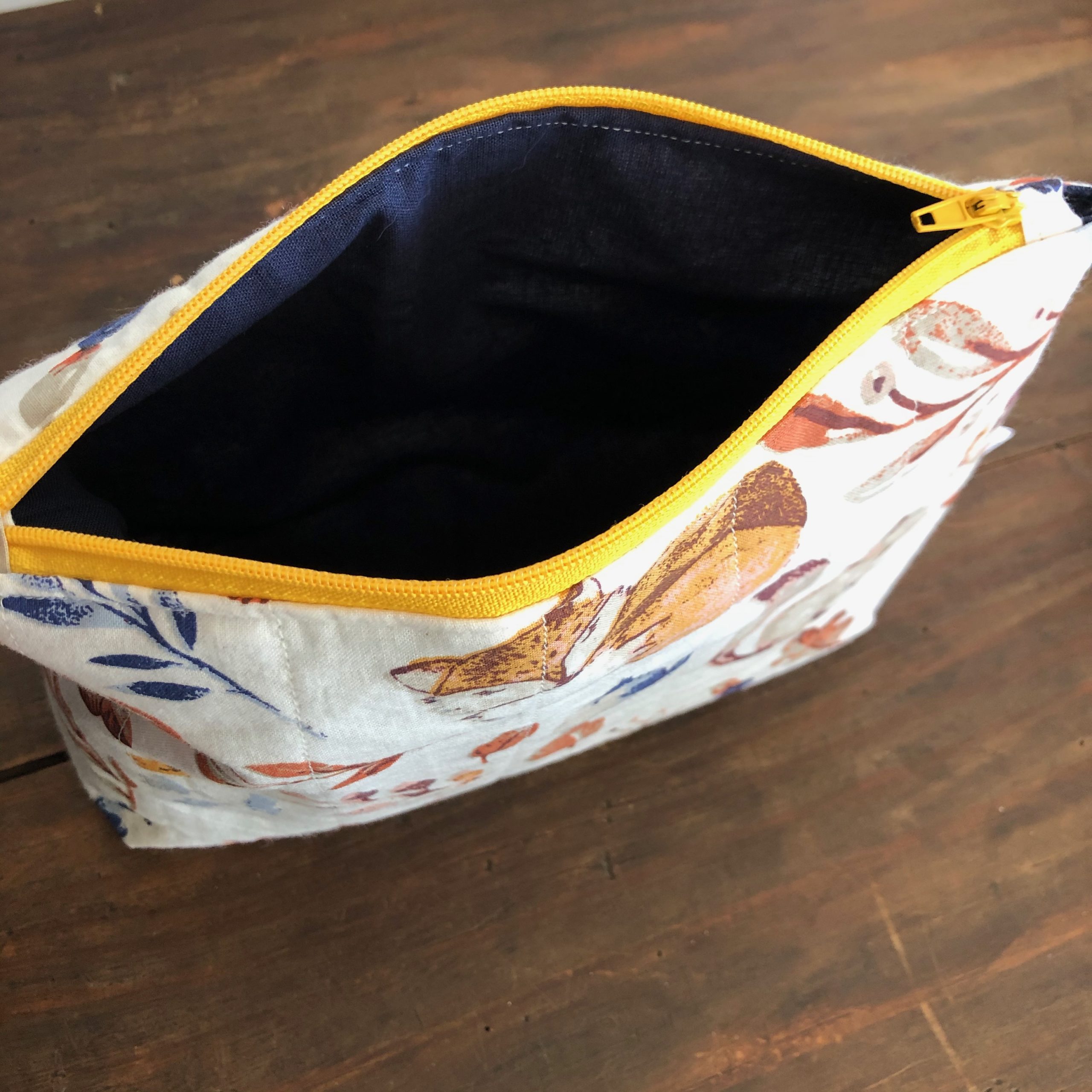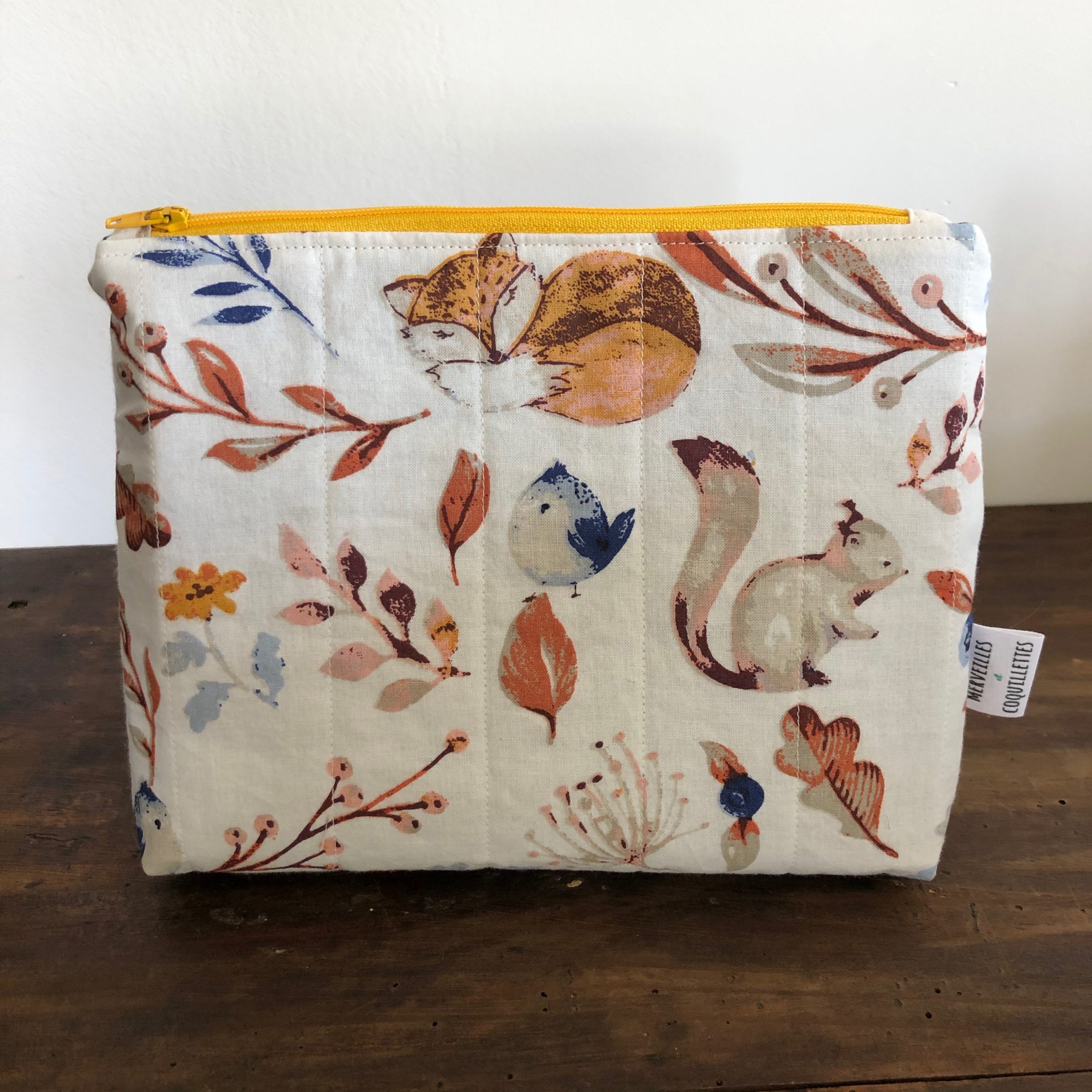 Cette pochette est constituée d’un tissu matelassé imprimé « forêt » et un coton uni marine. Le tout fermé par une petite fermeture éclair.