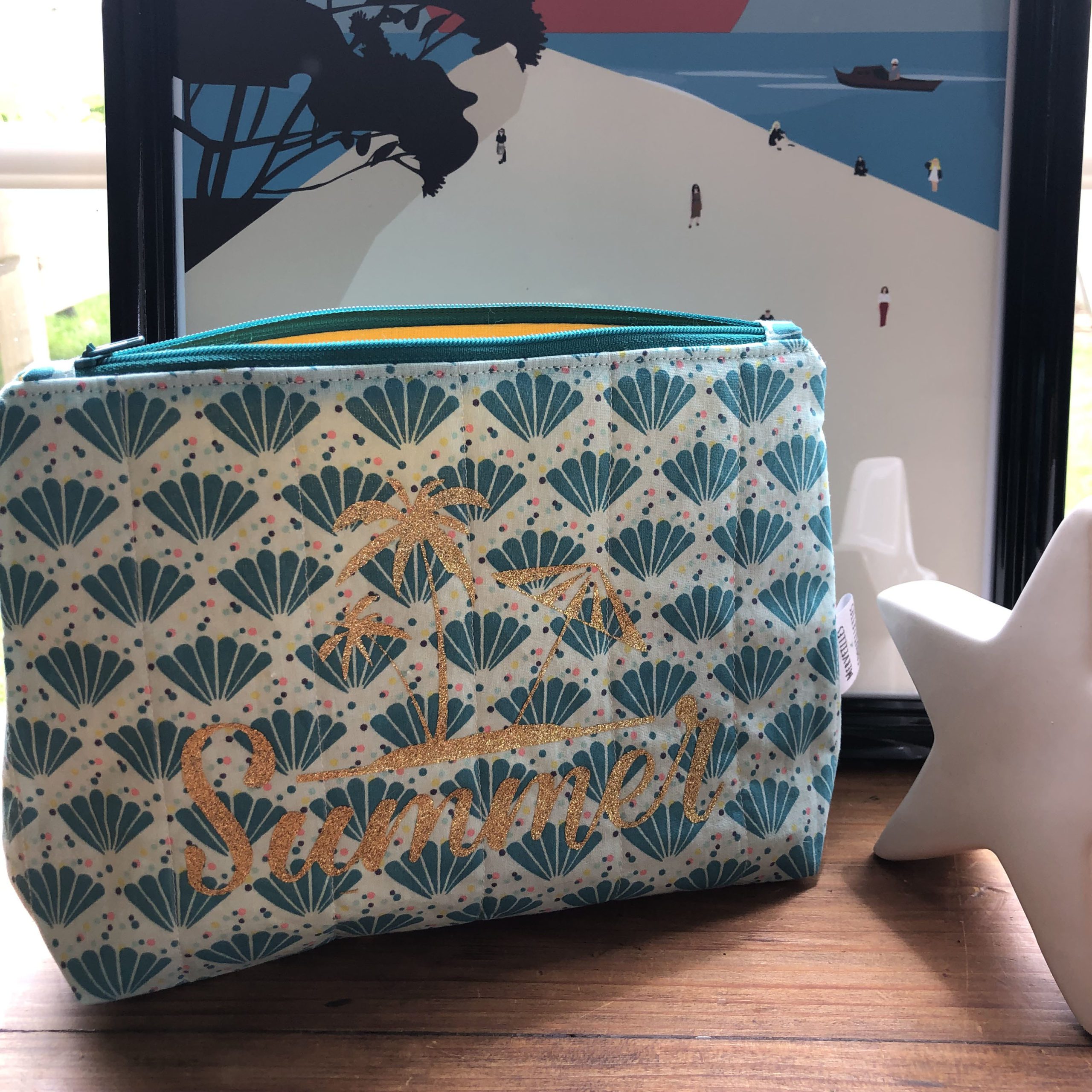 Cette pochette est constituée d’un tissu matelassé imprimé « summer time » et une doublure jaune. Le tout fermé par une petite fermeture éclair.