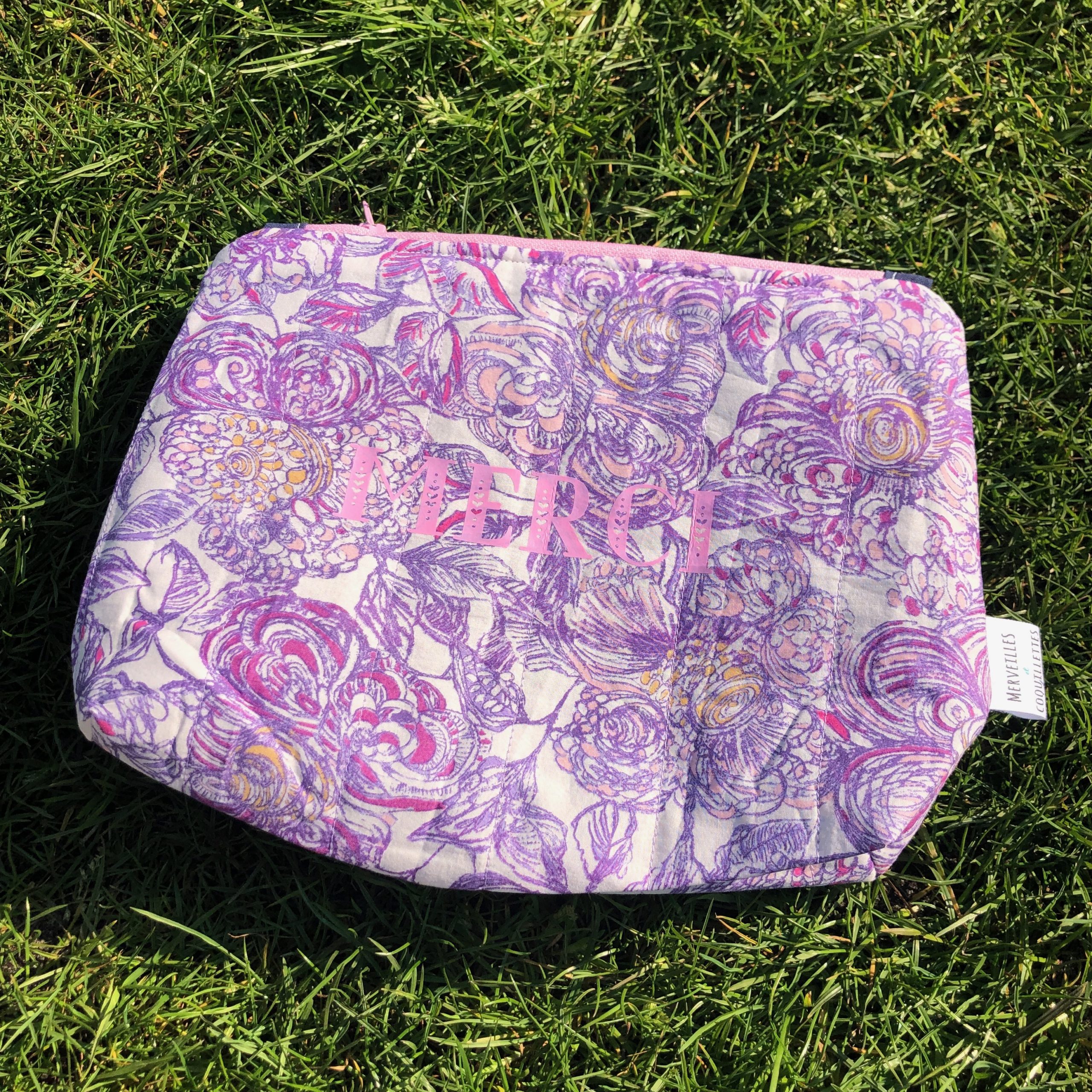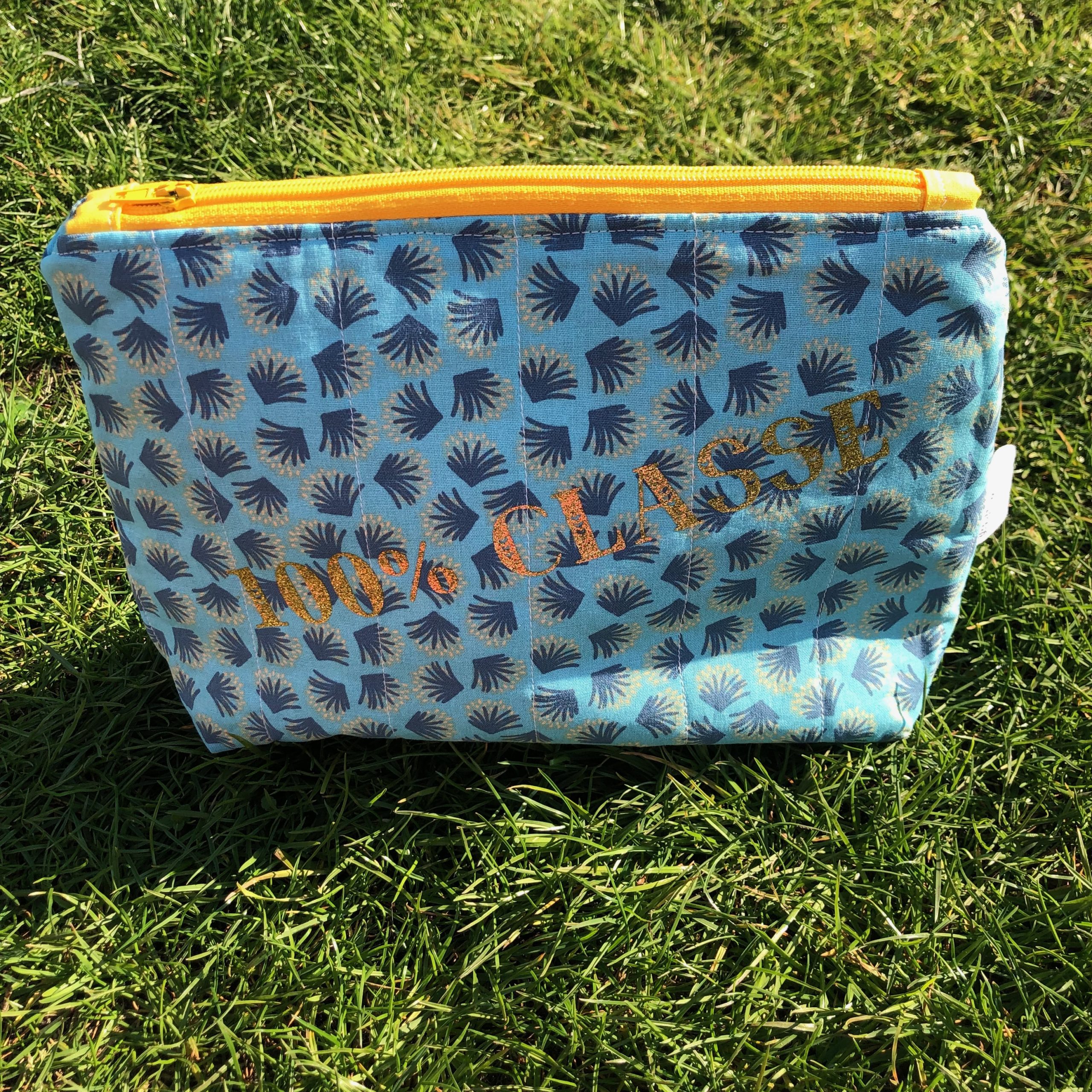 Cette pochette est constituée d’un tissu matelassé imprimé et d’une doublure. Le tout fermé par une petite fermeture éclair.