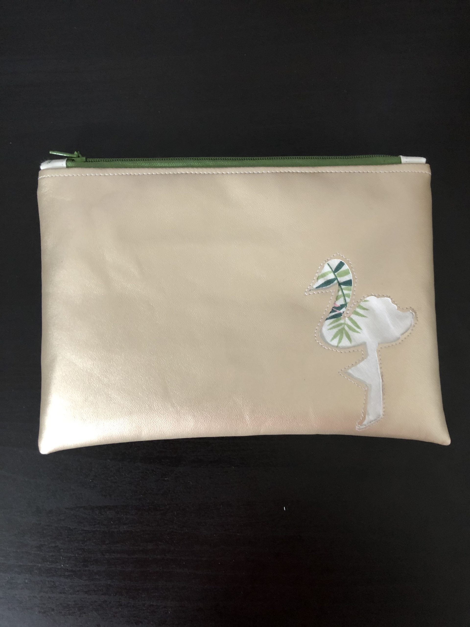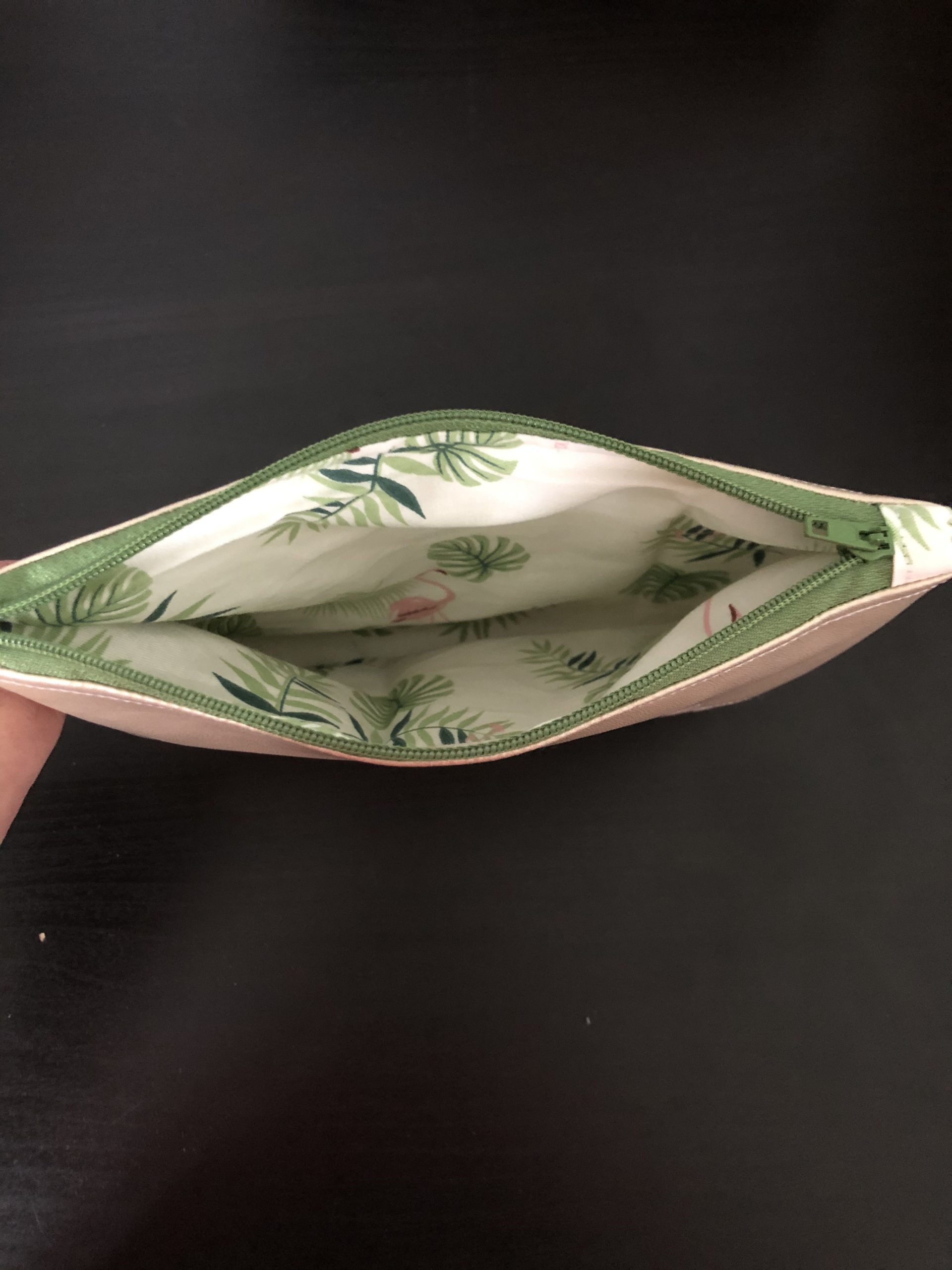 Cette pochette est constituée d’un simili cuir et une doublure imprimée tropicale. Le tout fermé par une petite fermeture éclair.