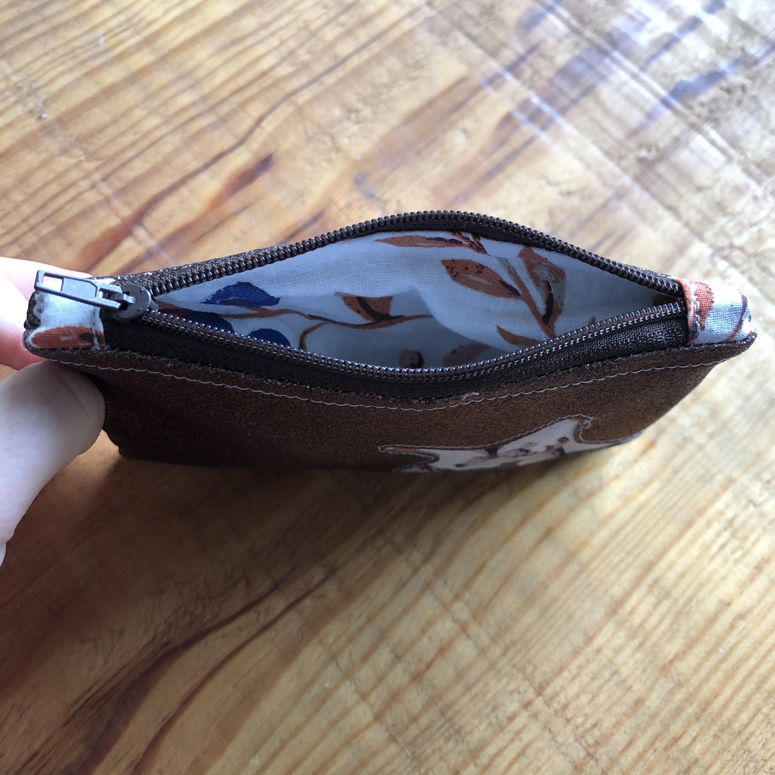 Ce porte monnaie est constitué d’un tissu pailleté et une doublure imprimée forêt d’automne. Le tout fermé par une petite fermeture éclair.