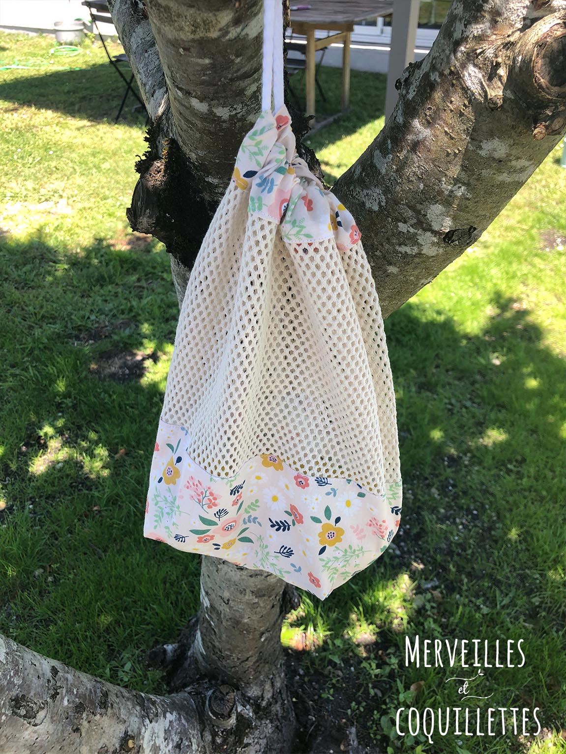 Filet à provision ou sac à vrac fait main. Fond plat pour accueillir des fruits ou légumes sans les écraser.