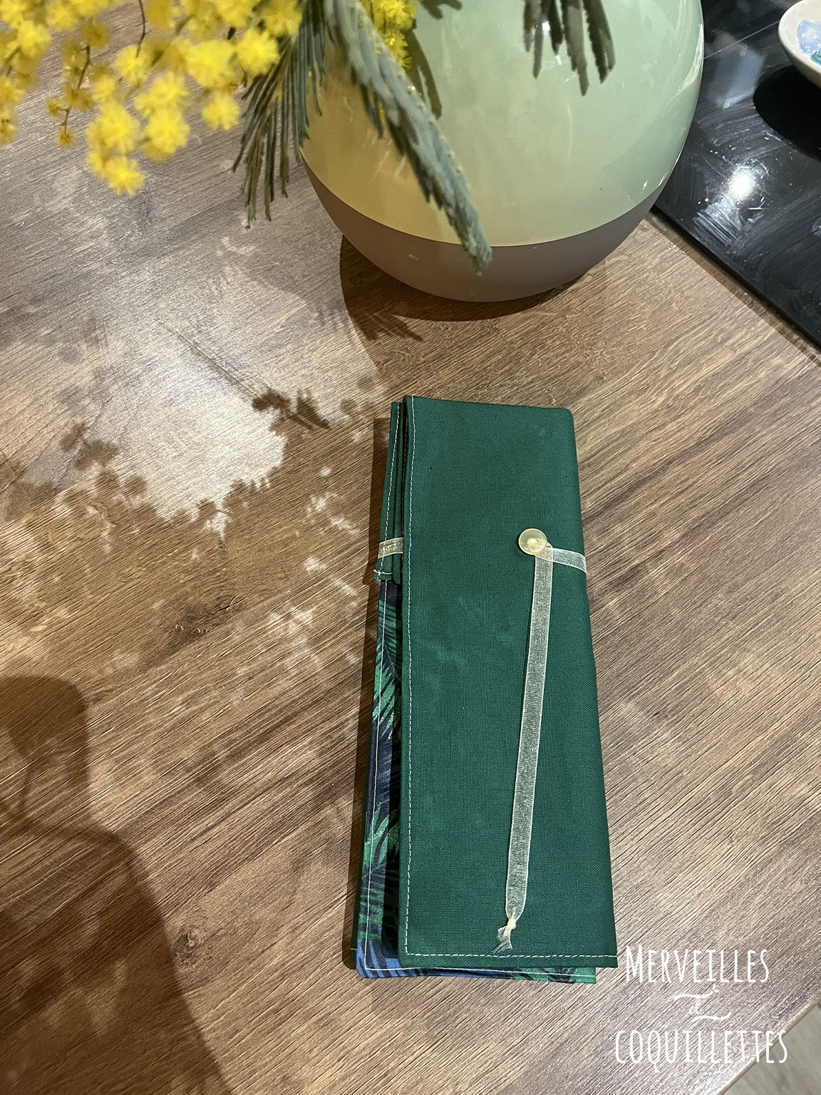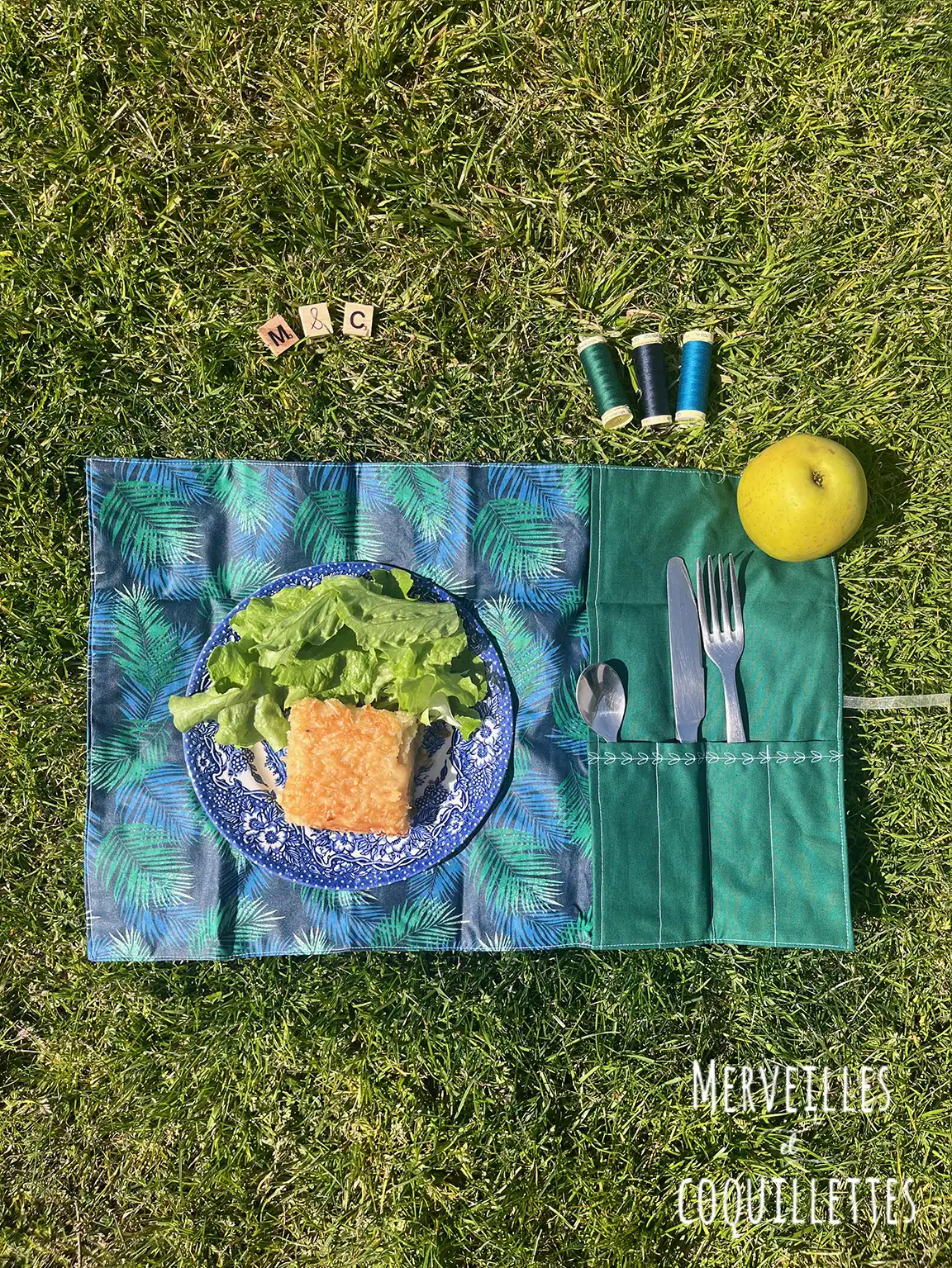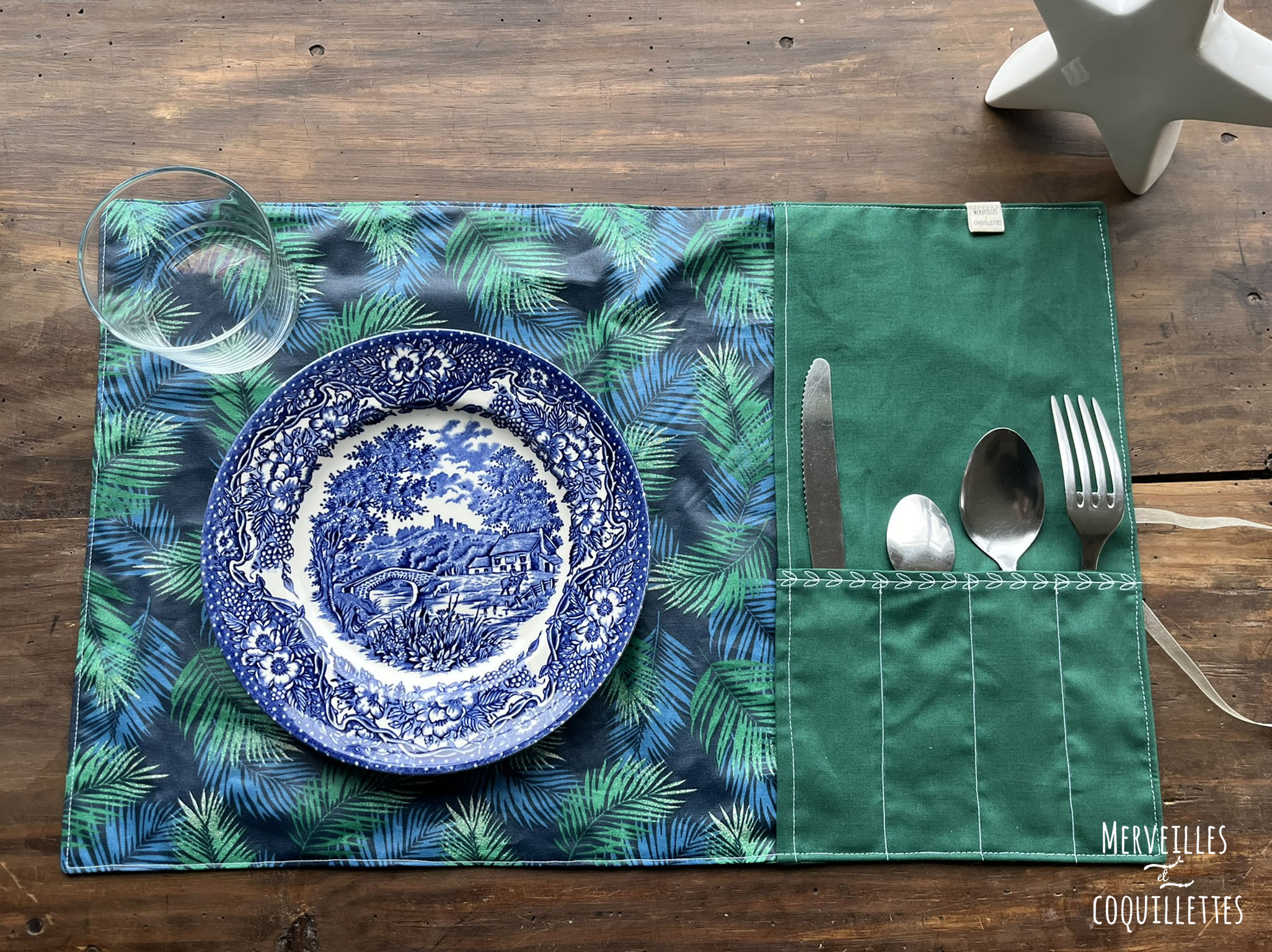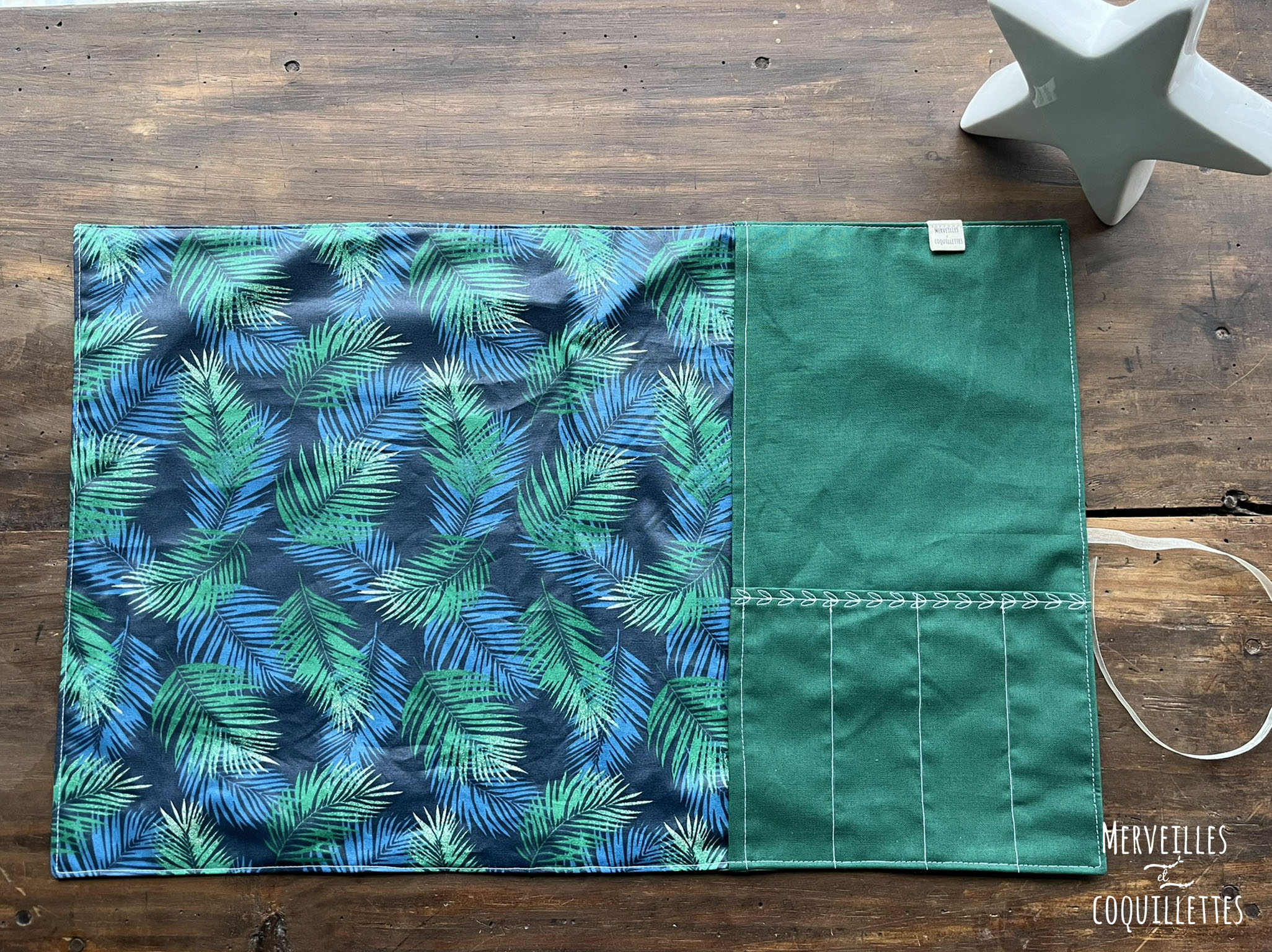 Coton couleur « vert » et Coton enduit imprimé « feuilles bleues et vertes »