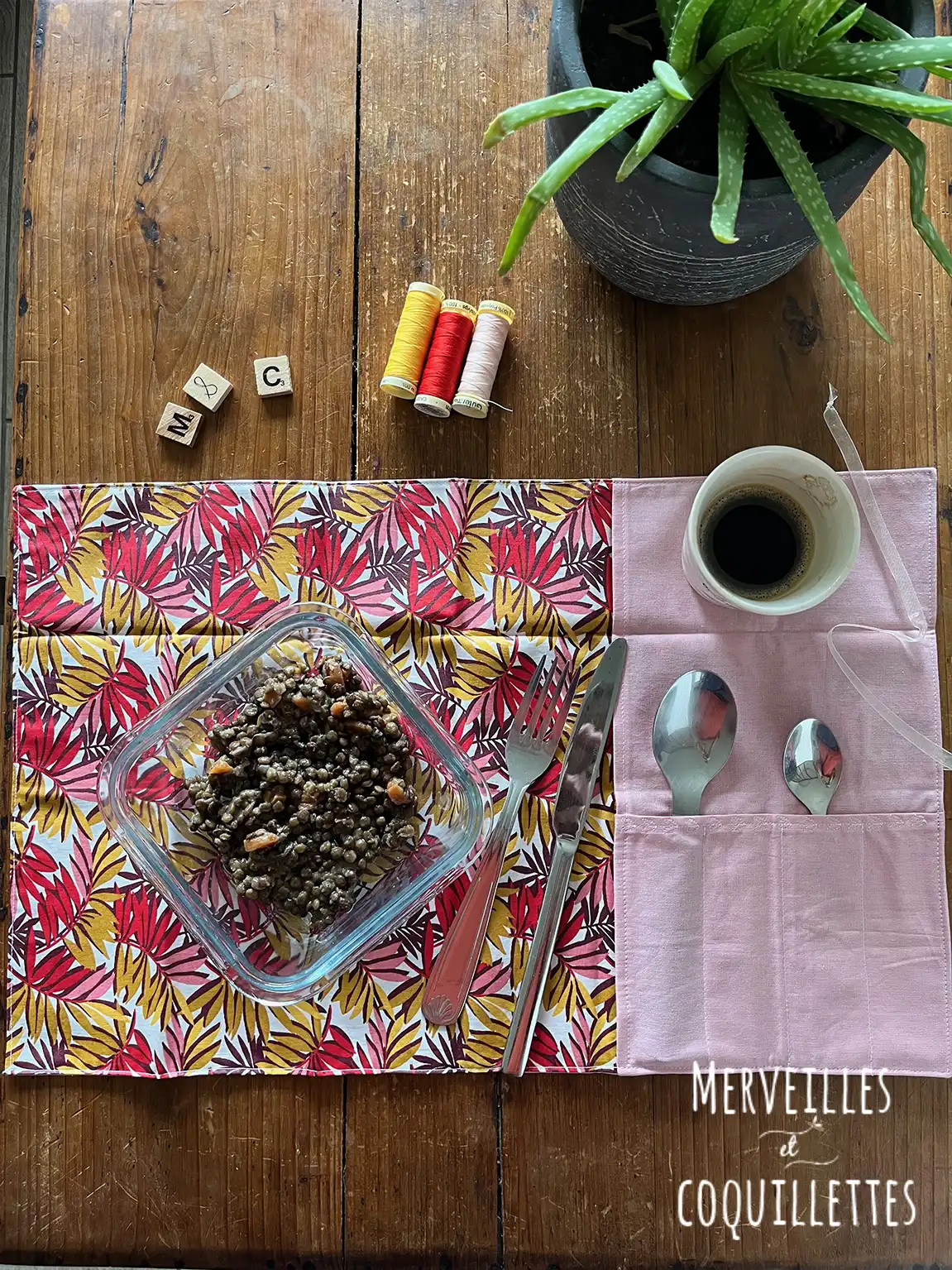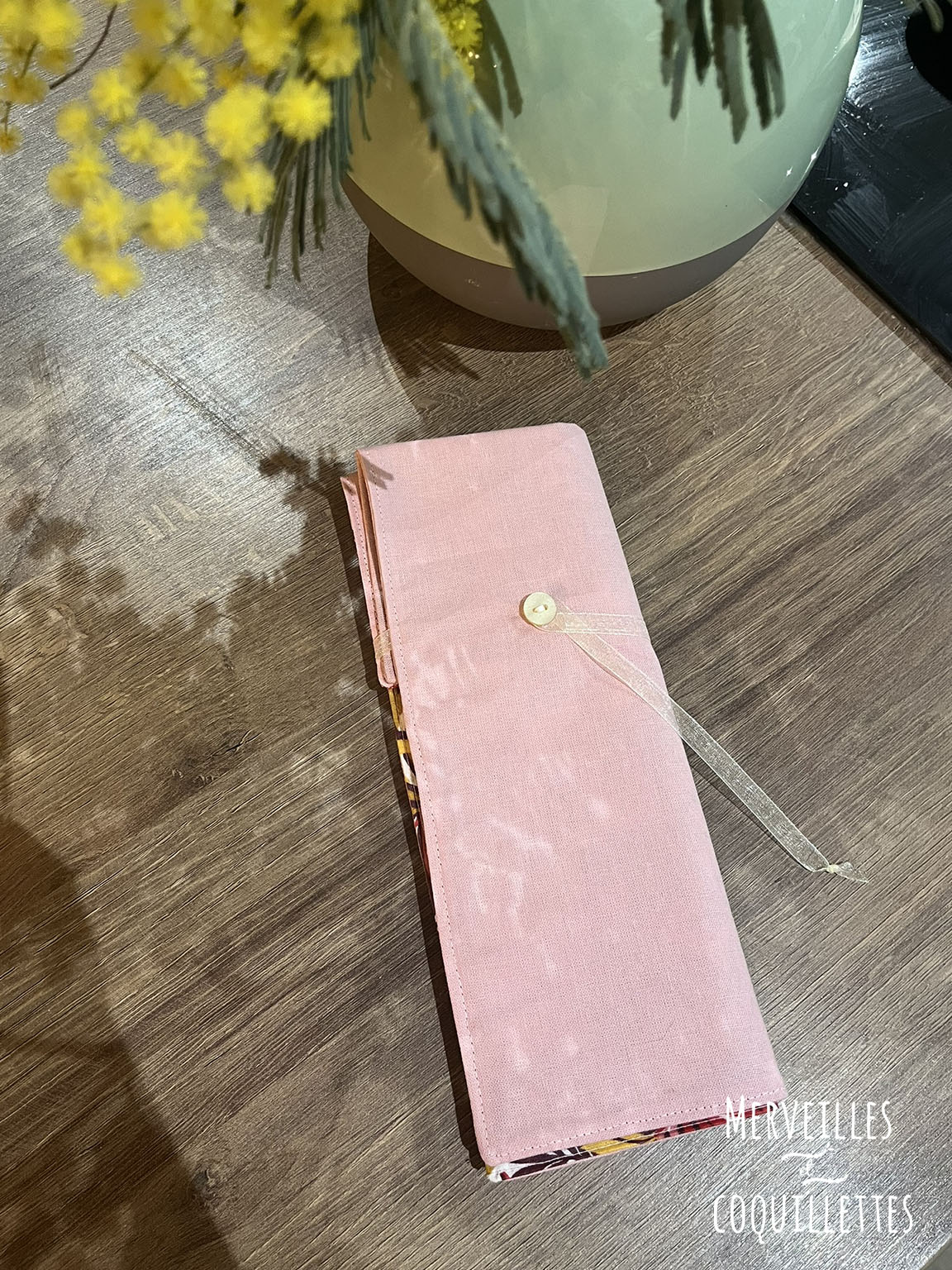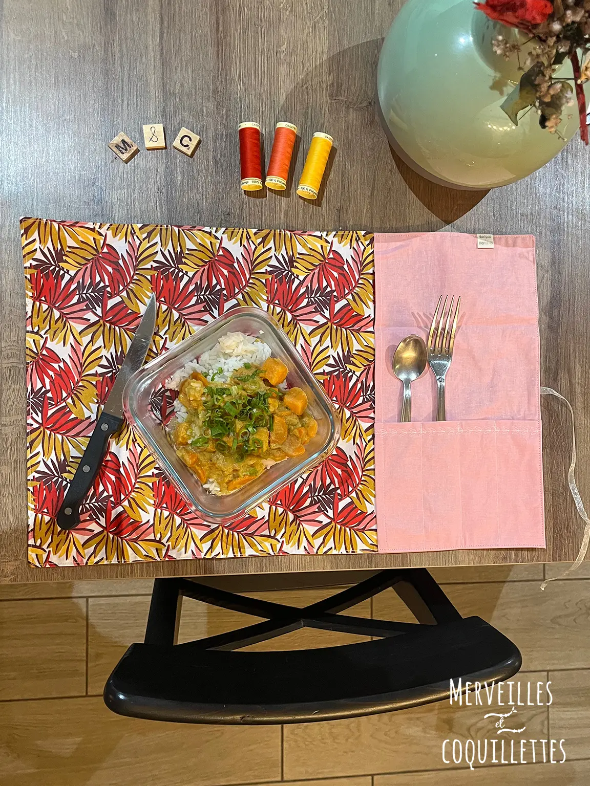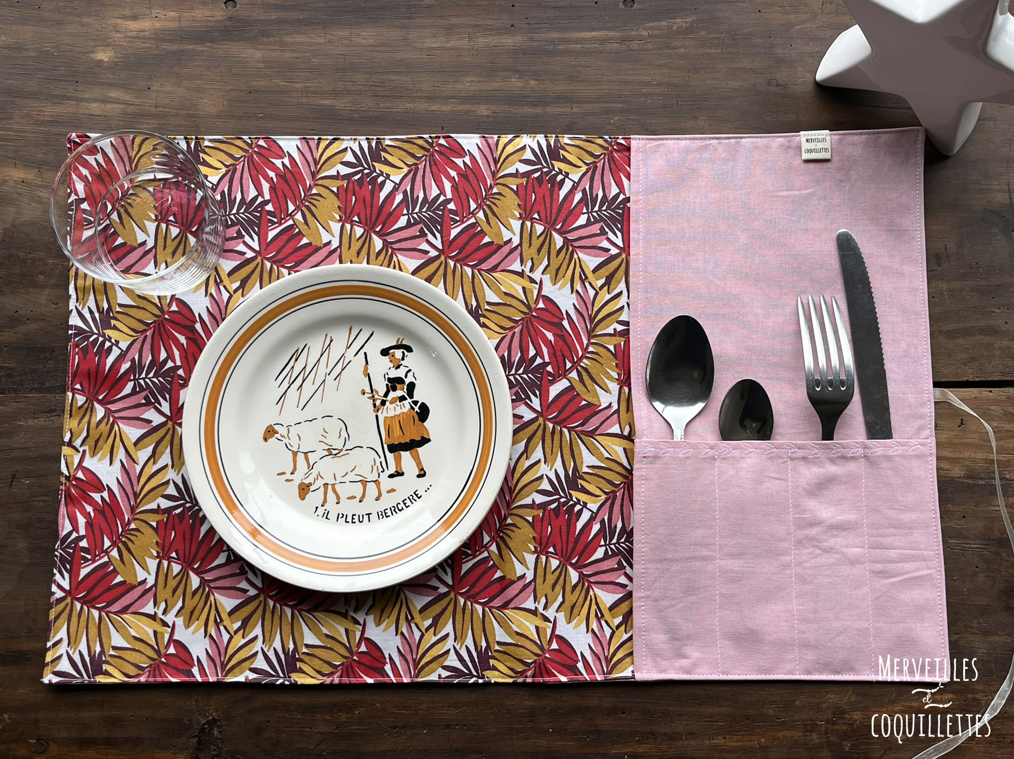 Coton couleur « rose » et Coton enduit imprimé « feuilles rouges et jaunes »