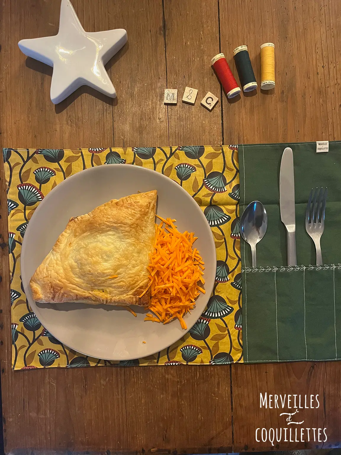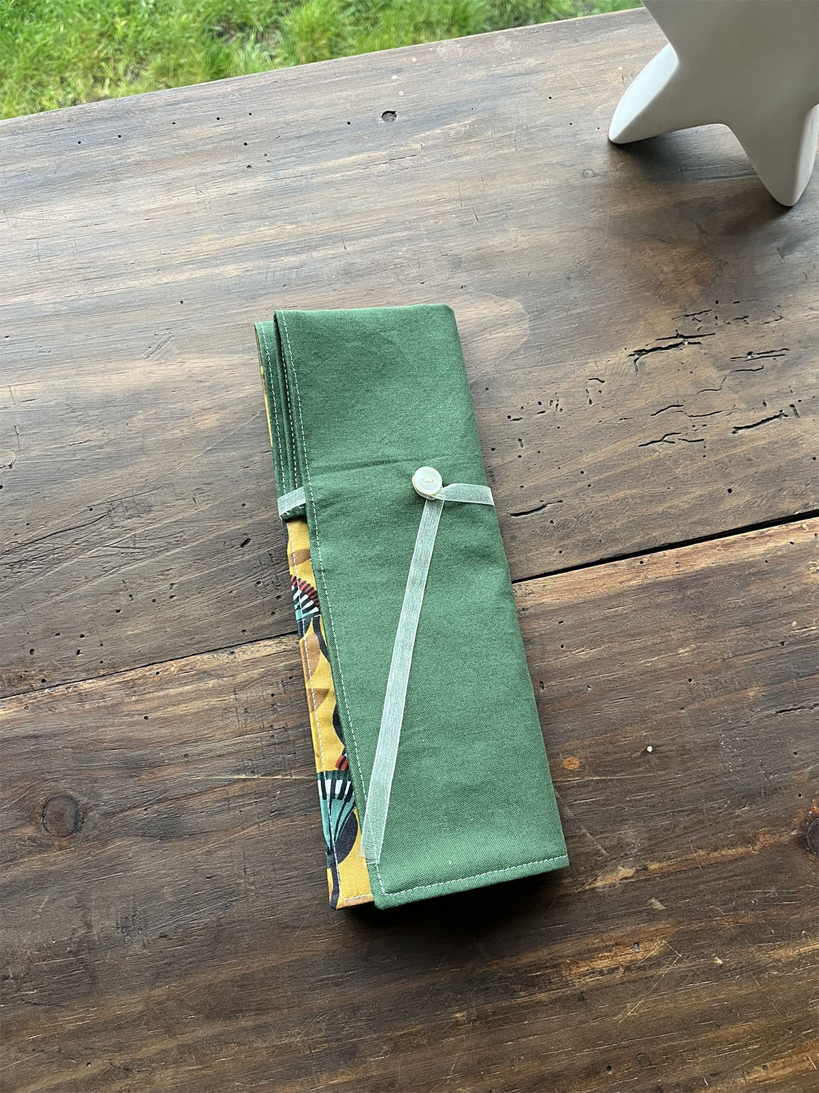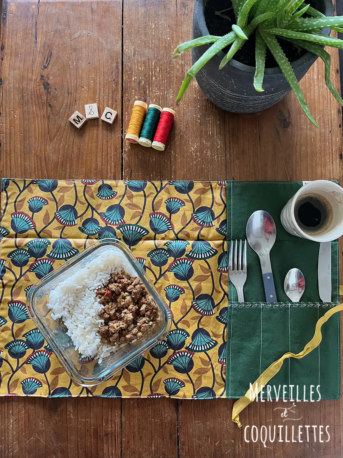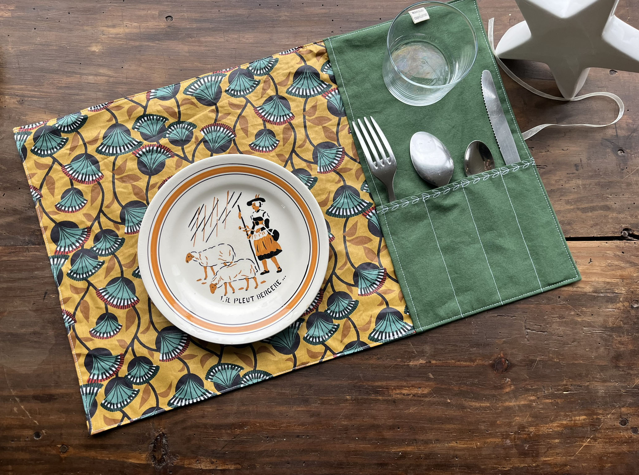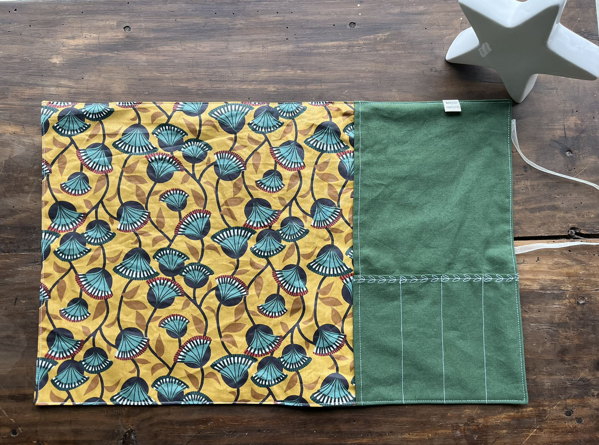 Coton couleur « vert sapin » et Coton enduit imprimé « Nyer moutarde »