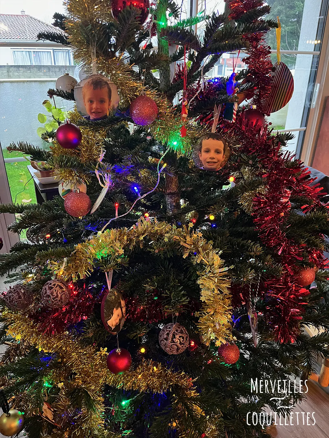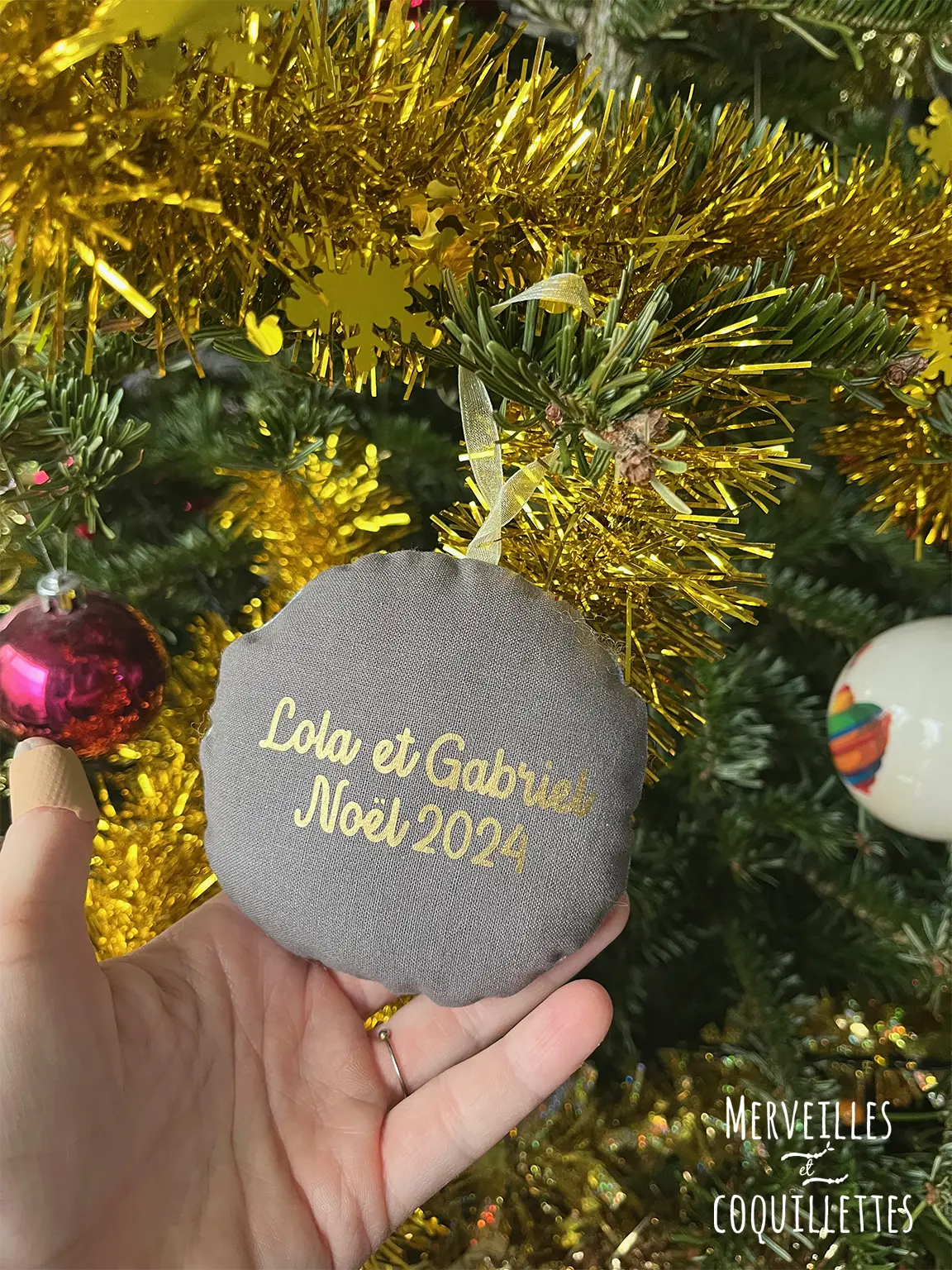 Boule de noël personnalisée avec une photo sur le devant et un prénom, un surnom ou une date au dos. Réalisée sur commande.